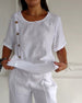 SPECIFIKATIONER Topptyp: Toppar Stil: Enkel Material: Bomull och linne Tillfälle: Dagligen, Semester Urringning: Rund nacke Mönstertyp: Enfärgade Typ av ärm: Vanlig ärm Ärmlängd: Kortärmad Passform typ: Vanlig Säsong: Vår, Sommar, Höst Detaljer: Knappar Paketet innehåller: 1 x Topp STORLEKSTABELL(cm) Storlek Byst Längd S 95 68 M 100...