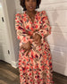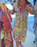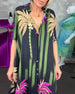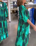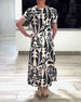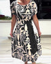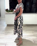 Avslappnad lös klänning med lövtryck med slits och kort ärm