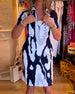 Avslappnad klänning med huva i ficka i färg med blocktryck