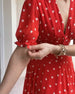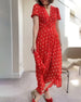 SPECIFIKATIONER Stil: Elegant Material: Bomullsblandningar Klänningstyp: A-linje Klänning längd: Maxi Urringning: V-hals_V Mönstertyp: Polka prickig Typ av ärm: Vanlig ärm Ärmlängd: Kortärmad Detaljer: Slits Passform typ: Vanlig Säsong: Vår, Sommar, Höst Tillfälle: Dagligen Paketet innehåller: 1 x Klänning STORLEKSTABELL(cm) Storle...