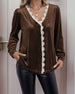 SPECIFIKATIONER Topptyp: Blusar Stil: Enkel Material: Spets,Sammet Tillfälle: Dagligen Urringning: V-hals_V Mönstertyp: Enfärgade Typ av ärm: Vanlig ärm Ärmlängd: Långärmad Passform typ: Vanlig Säsong: Vår,Höst,Vinter Detaljer: Lappverk,Knappar Paketet innehåller: 1 x Blus STORLEKSTABELL(cm) Storlek Byst Längd S 97 65 M 101 66.5 L 105 ...