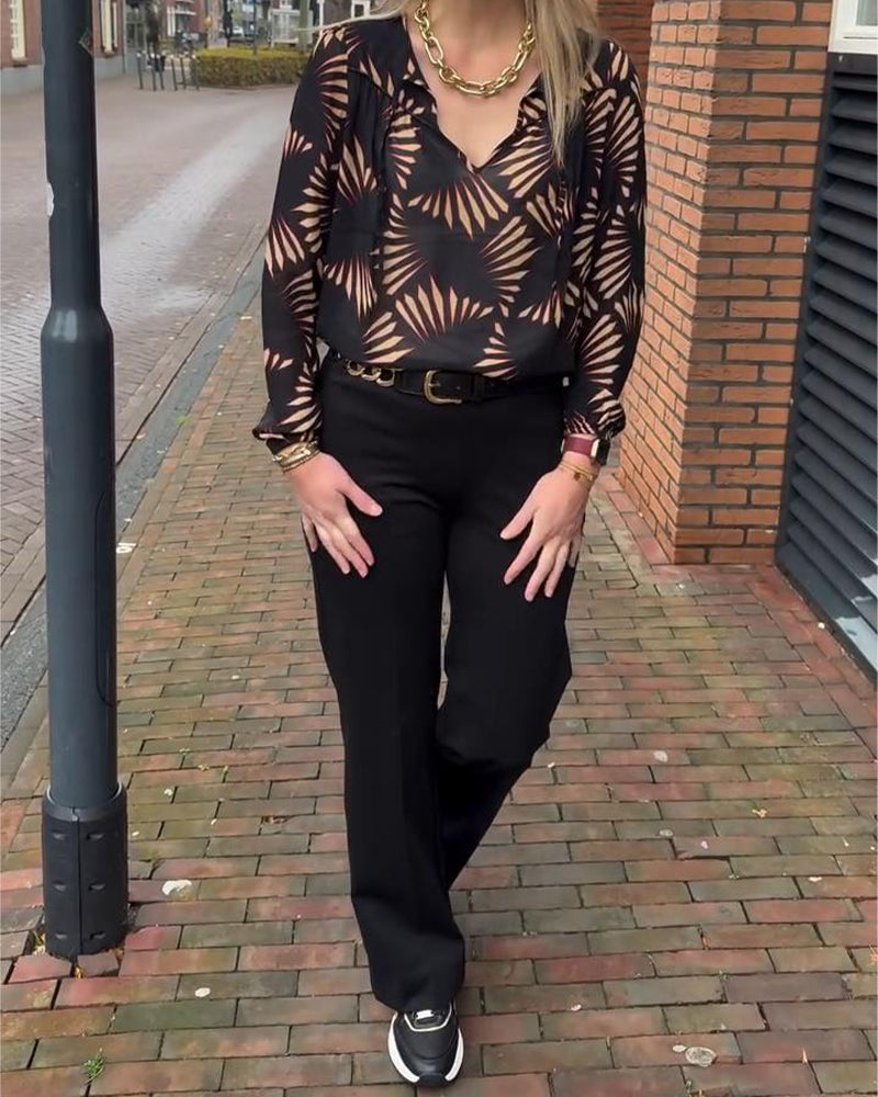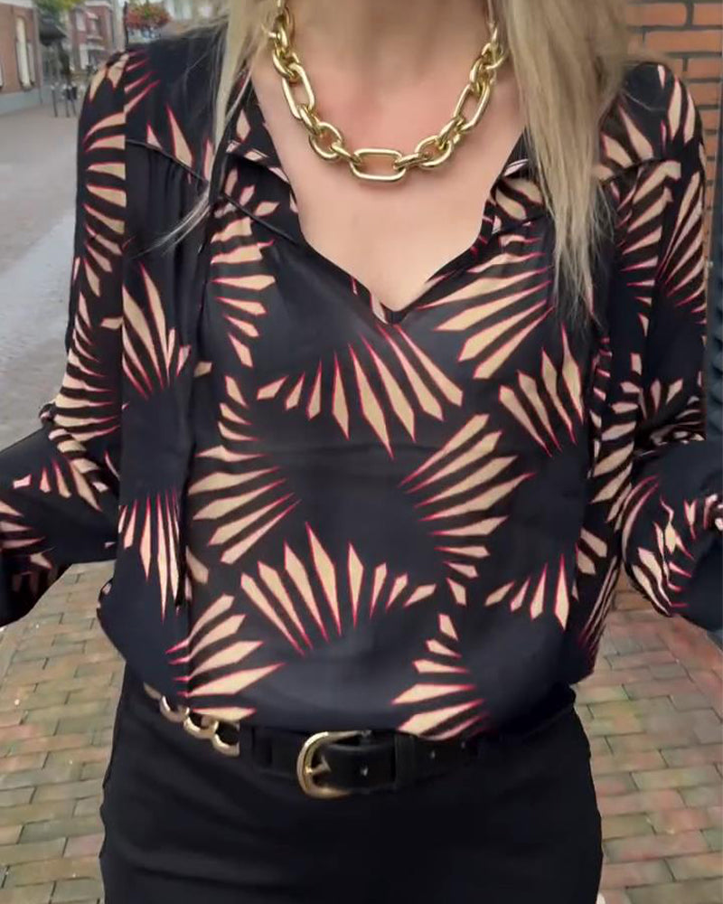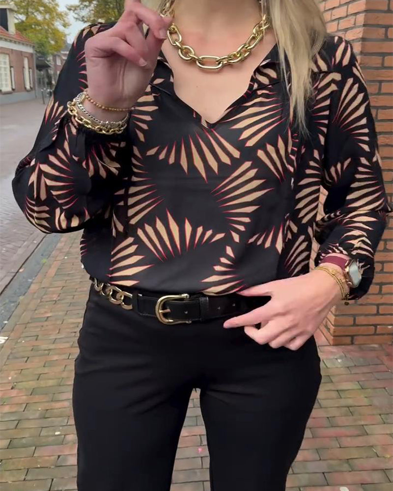 Tryckt Casual Topp Med V-Ringning Och Långa Ärmar