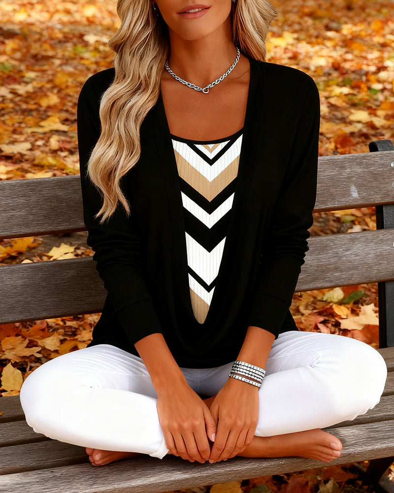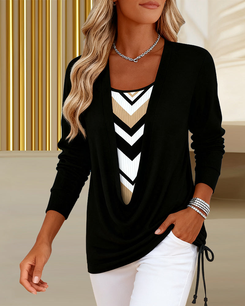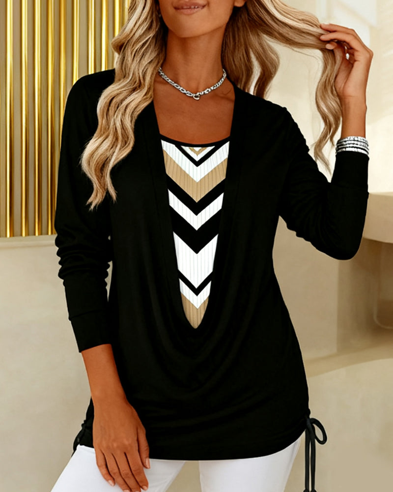Tryckt Casual Topp Med V-Ringning Och Långa Ärmar