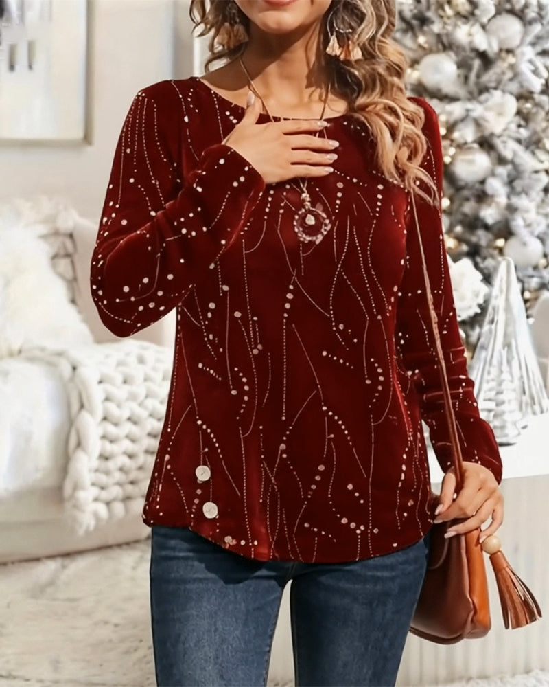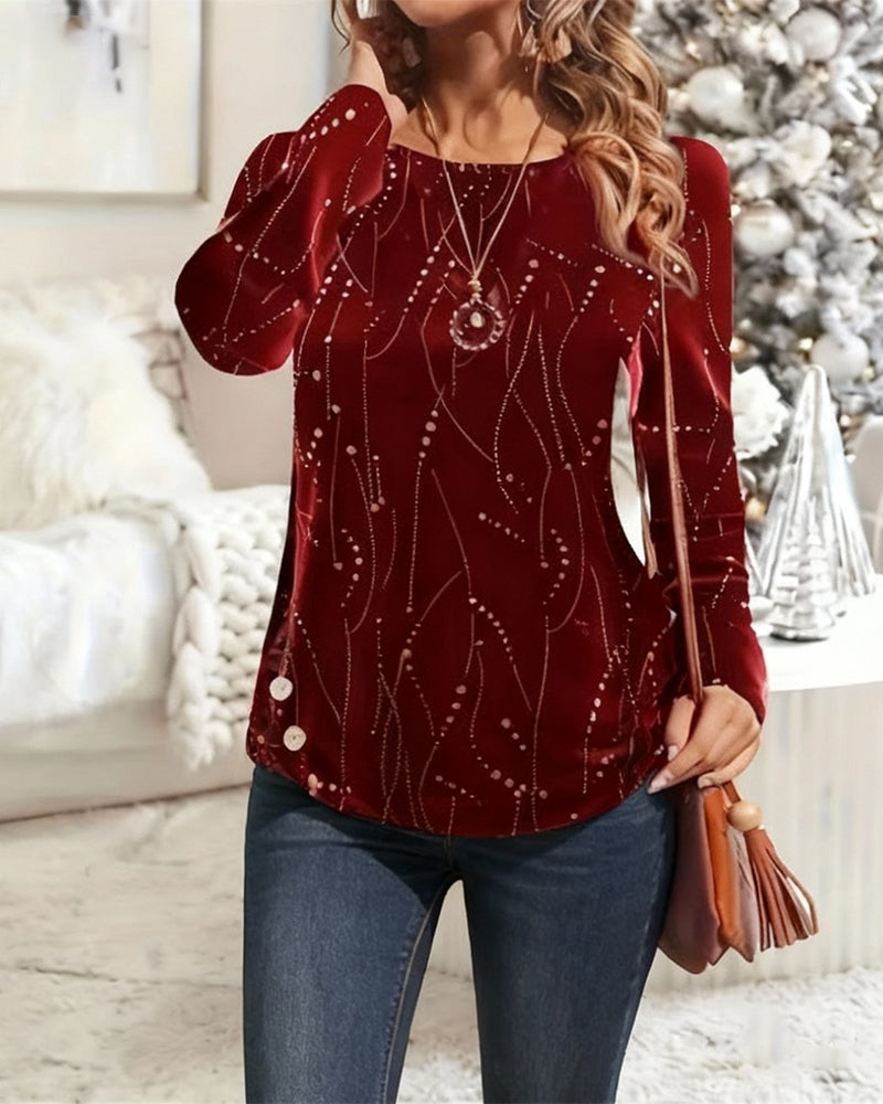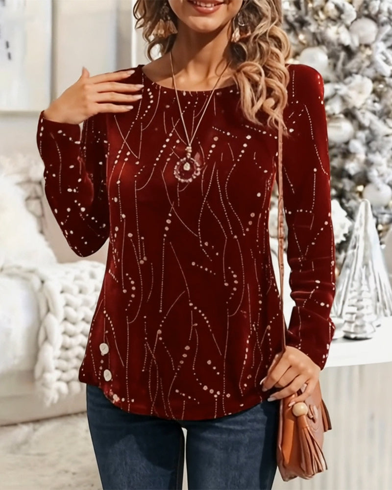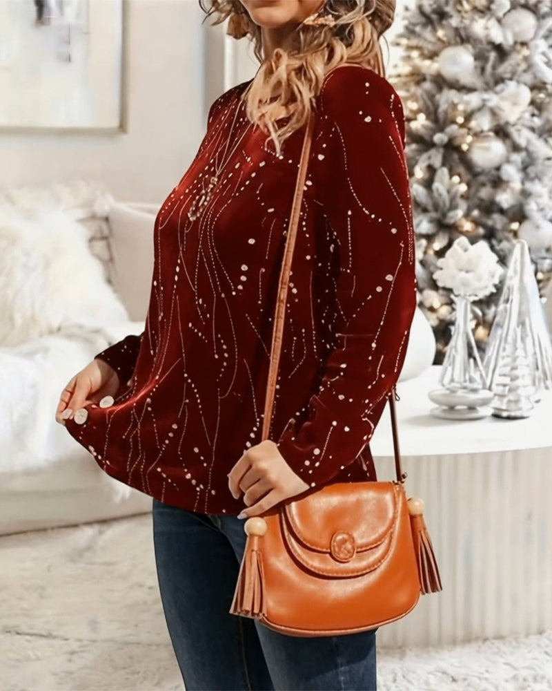 Tryckt Casual Topp Med V-Ringning Och Långa Ärmar