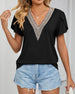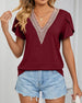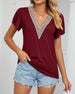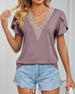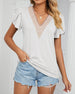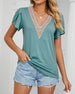 SPECIFIKATIONER Topptyp: T-shirt Stil: Elegant Material: Bomullsblandningar Tillfälle: Dagligen Urringning: V-hals_V Mönstertyp: Enfärgade Typ av ärm: Volangärm Ärmlängd: Kortärmad Passform typ: Vanlig Säsong: Vår, Sommar, Höst Detaljer: Lappverk, Rufsad Paketet innehåller: 1 x T-shirt STORLEKSTABELL(cm) Storlek Byst Längd Armläng...