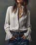 SPECIFIKATIONER Topptyp: Blusar Stil: Enkel Material: Denim Tillfälle: Dagligen Urringning: V-hals_V Mönstertyp: Enfärgade Typ av ärm: Vanlig ärm Ärmlängd: 3/4 ärm Säsong: Vår,Höst Detaljer: Rufsad Paketet innehåller: 1 x Blus STORLEKSTABELL(cm) Storlek Byst Längd S 97 68 M 101 69.5 L 105 71 XL 111 72.5 2XL 117 74 3XL 123 74 OB...