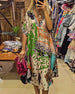 Casual klänning med leopard och färgglatt tryck och djupt V